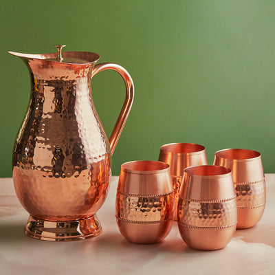 A complete family set that includes multiple glasses. - Royal Mughlai 5-Piece Copper Jug Set (1.5L)