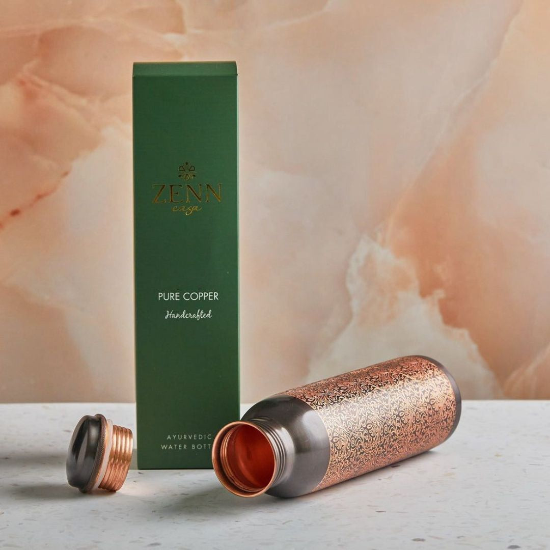 Hammered Black Etched Ayurvedic Pure Copper Bottle 1L Hammered Black Etched Ayurvedic Pure Copper Bottle 1L A pure copper ayurvedic water bottle with a black etched design, placed on a marble surface. Three beautifully crafted copper water bottles with icons highlighting Zenn Casa's sustainable, handcrafted, and high-quality products. Copper-infused water bottles with health benefits listed on a Zenn India branded background.
